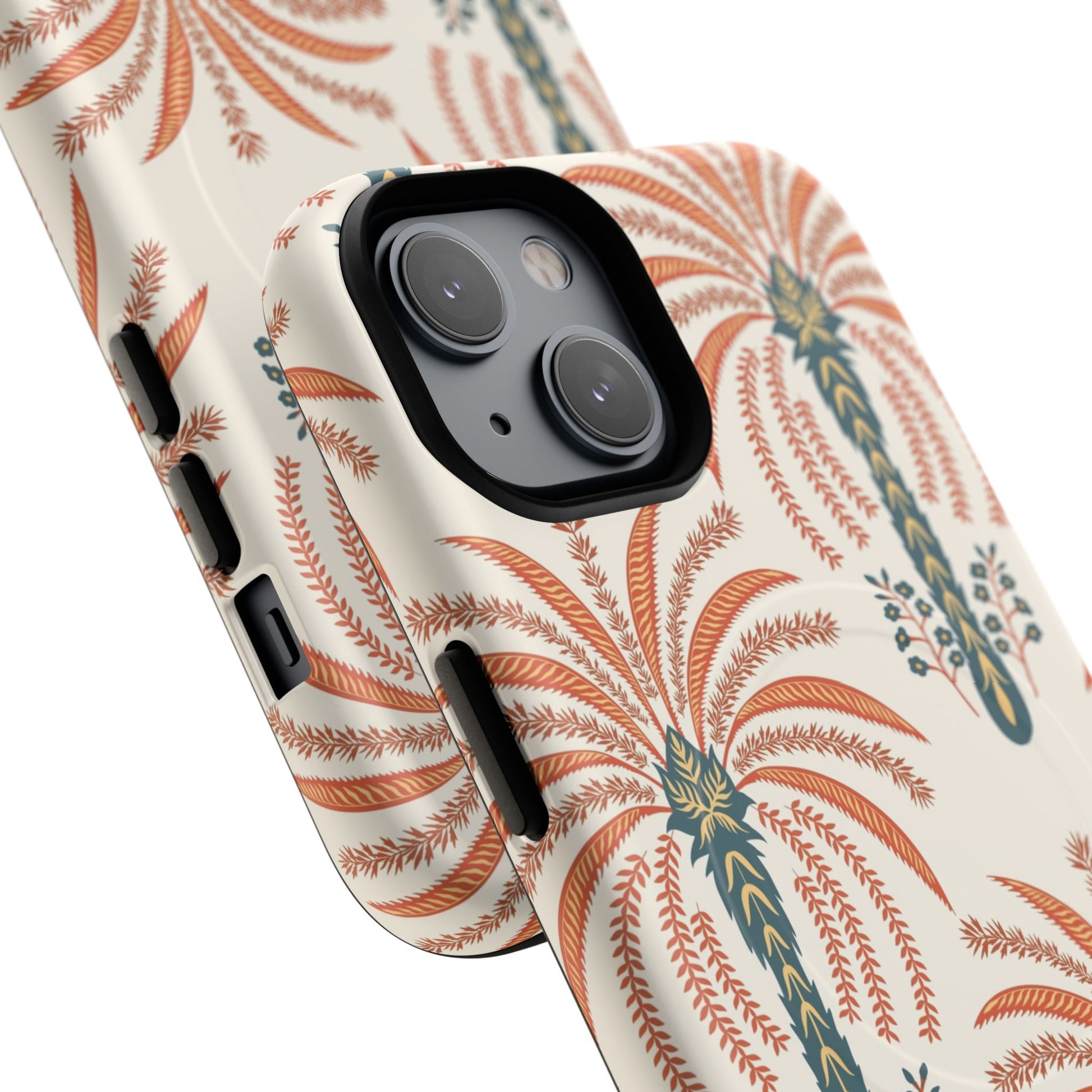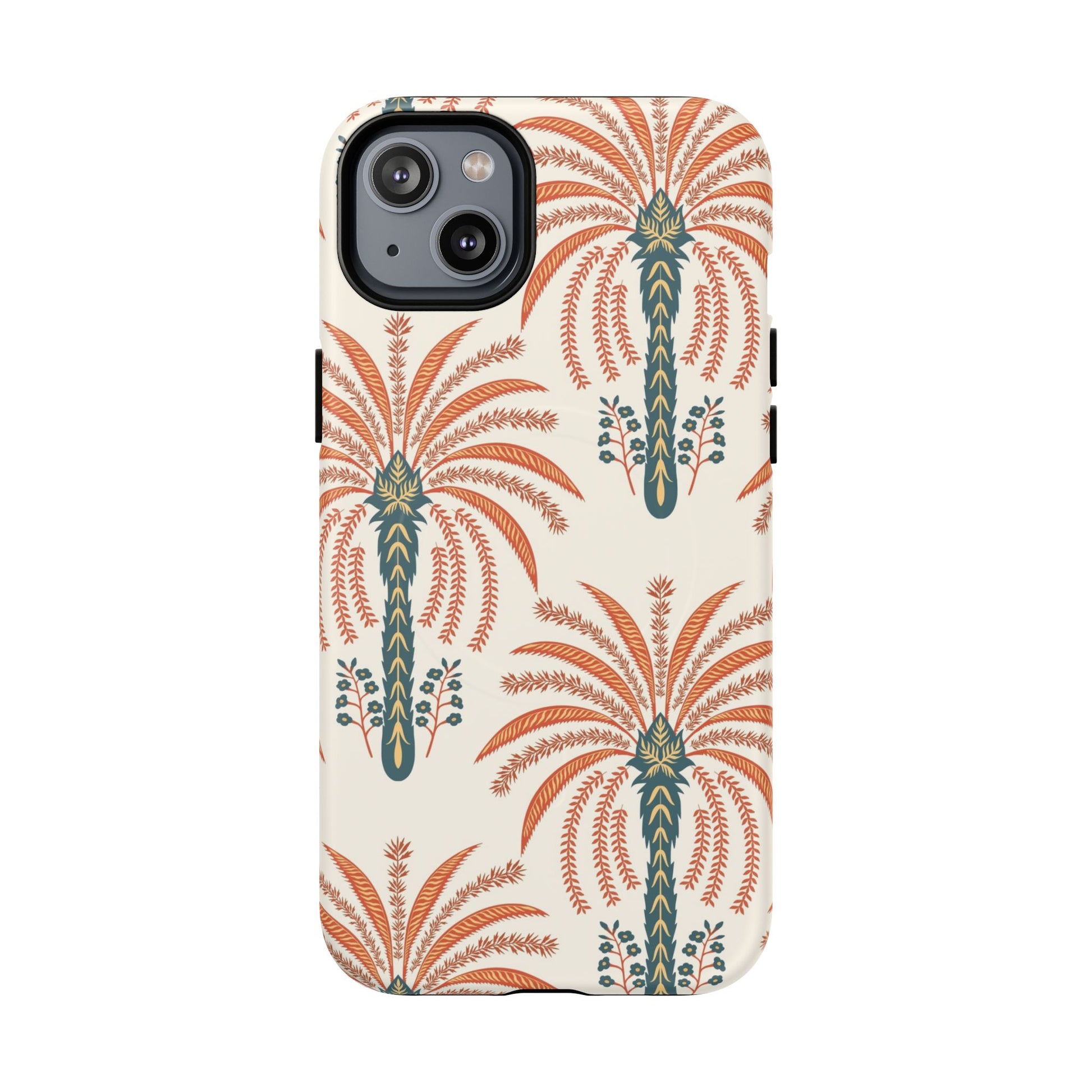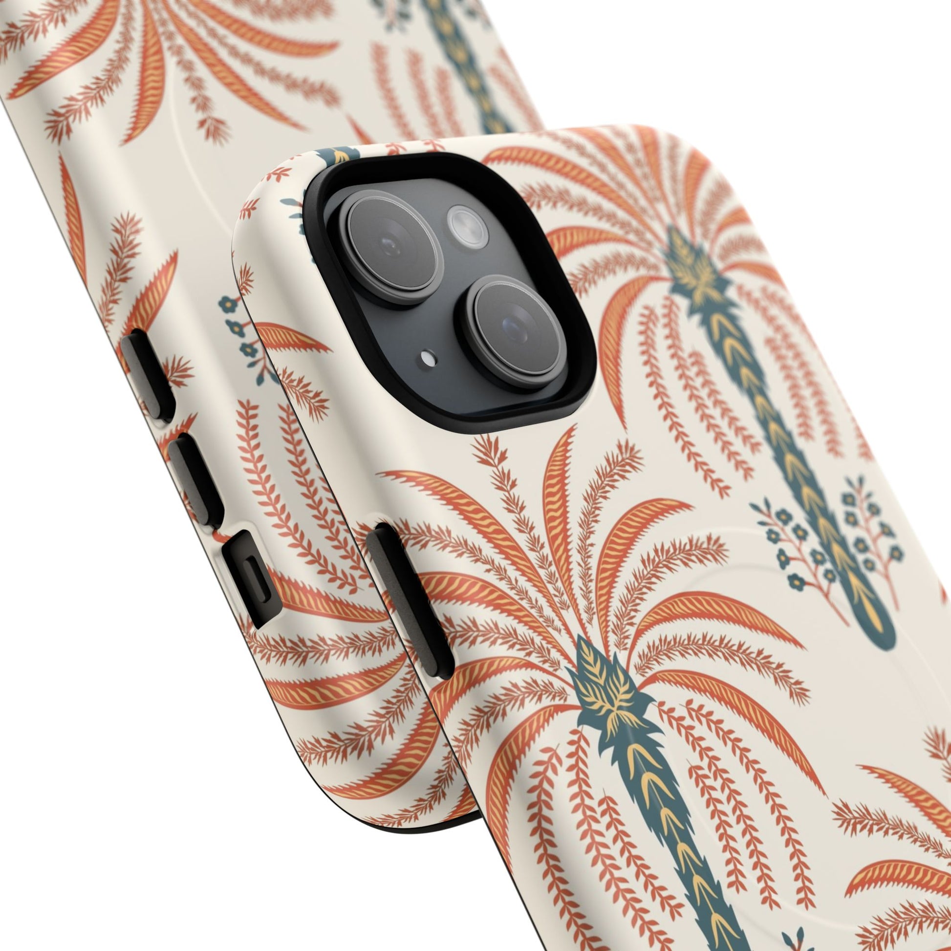 Lightweight yet rugged, this magnetic phone case blends everyday protection with vintage botanical style. The dual-layer construction — a hard polycarbonate shell over a shock-absorbing TPU liner — guards your phone from drops while the built-in MagSafe-compatible module keeps your wireless accessories snapping into place. The soft cream background and warm terracotta palm motif bring an earthy, retro vibe that complements linen bags, market runs, and late-afternoon walks. It feels pulled-together in hand: smooth glossy or subtle matte finishes let the pattern sing, while precise cutouts and a raised lip protect the camera and screen. For those who care about both form and function, this case keeps your device secure without sacrificing personality.