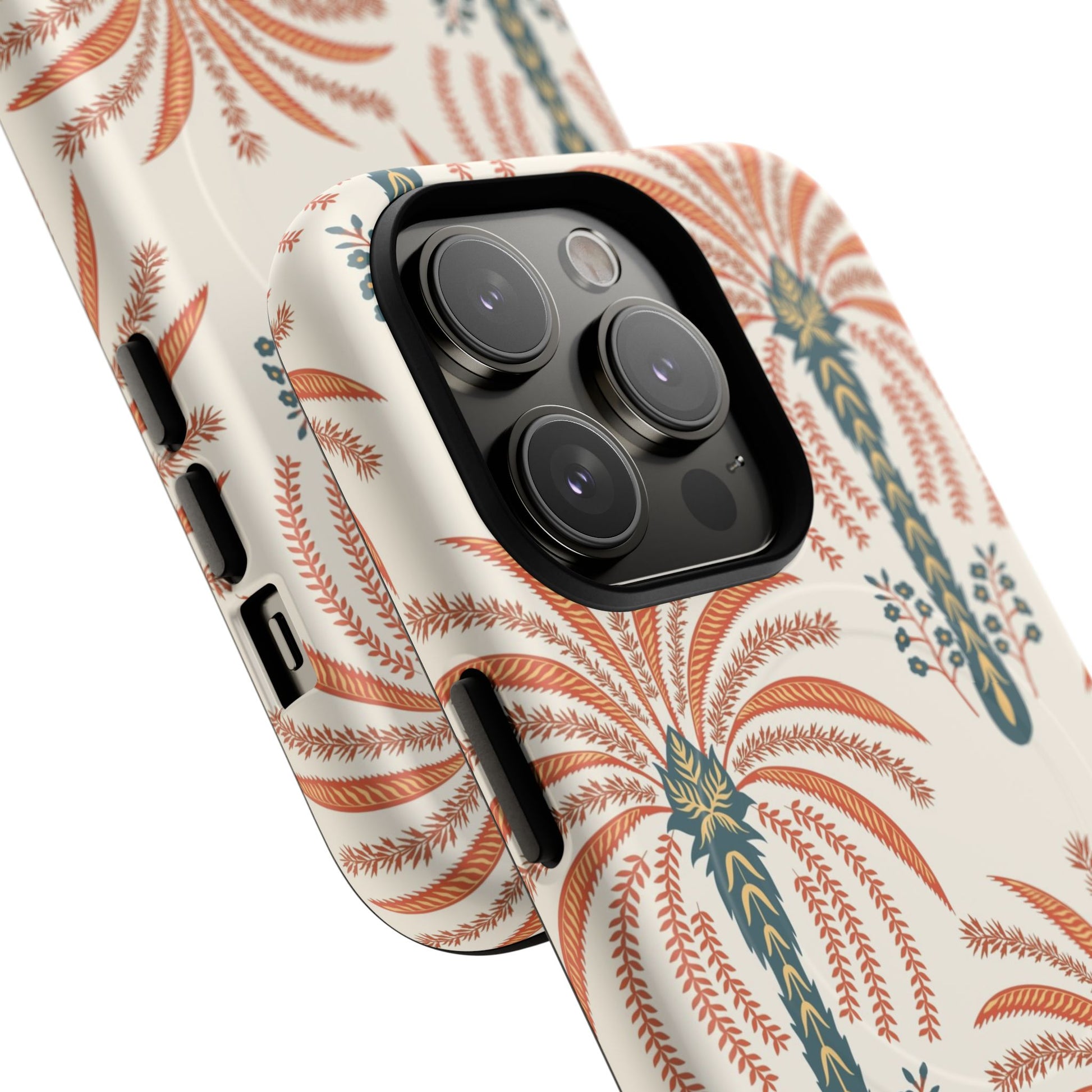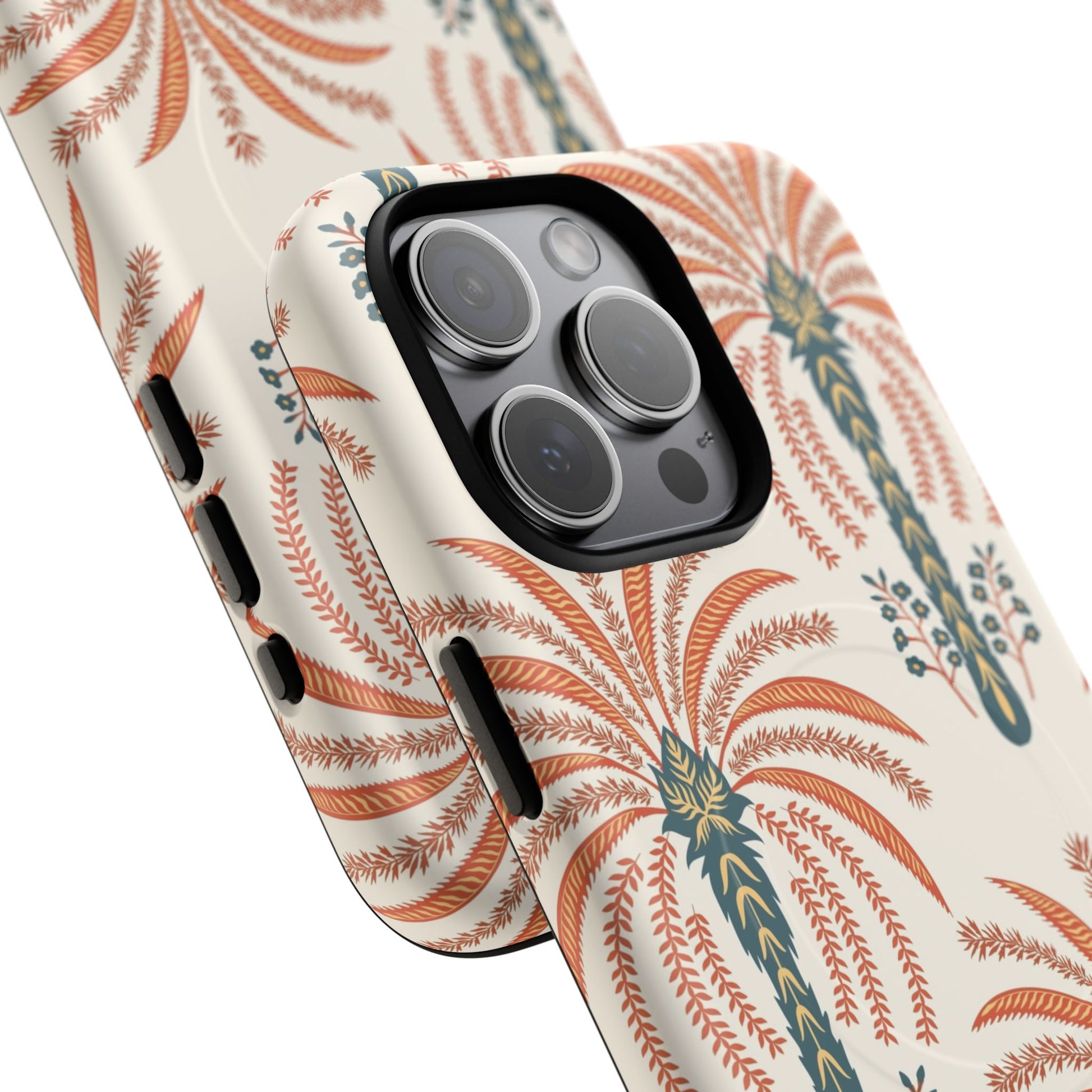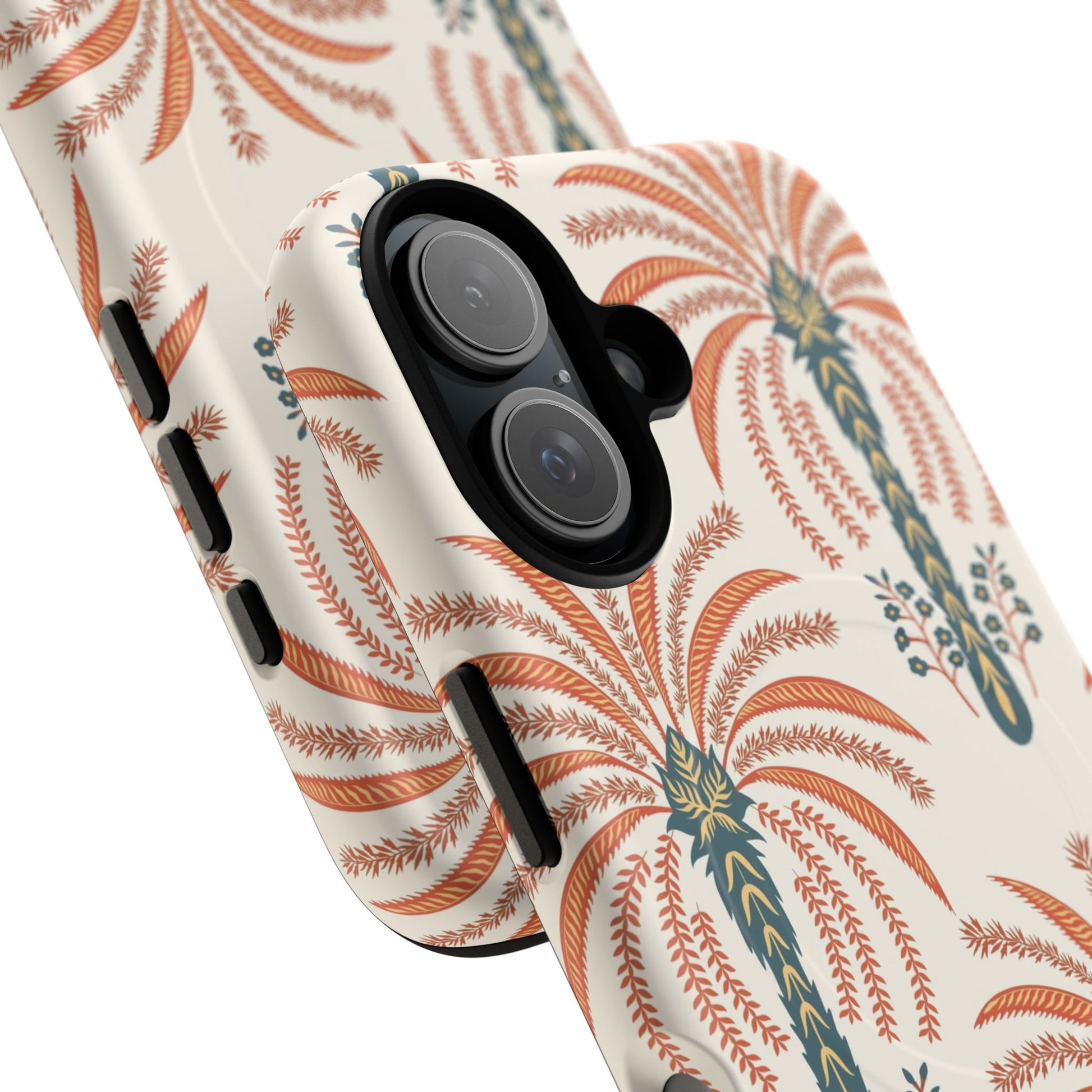 Lightweight yet rugged, this magnetic phone case blends everyday protection with vintage botanical style. The dual-layer construction — a hard polycarbonate shell over a shock-absorbing TPU liner — guards your phone from drops while the built-in MagSafe-compatible module keeps your wireless accessories snapping into place. The soft cream background and warm terracotta palm motif bring an earthy, retro vibe that complements linen bags, market runs, and late-afternoon walks. It feels pulled-together in hand: smooth glossy or subtle matte finishes let the pattern sing, while precise cutouts and a raised lip protect the camera and screen. For those who care about both form and function, this case keeps your device secure without sacrificing personality.